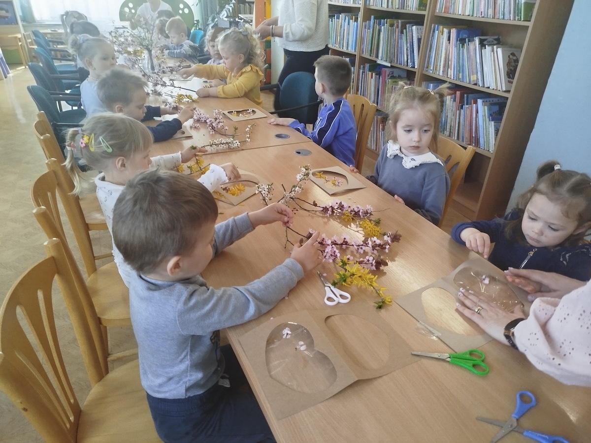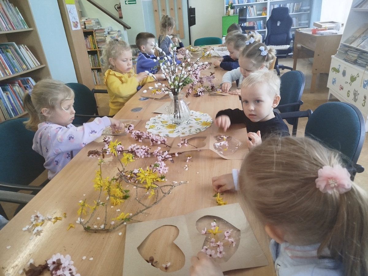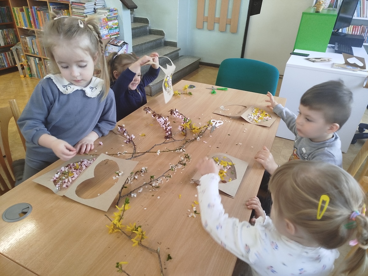 Dzieci wysłuchały bajek czytanych przez panie. Następnie wykonywały wiosenne zakładki do książek wykorzystując wiosenne dary natury.