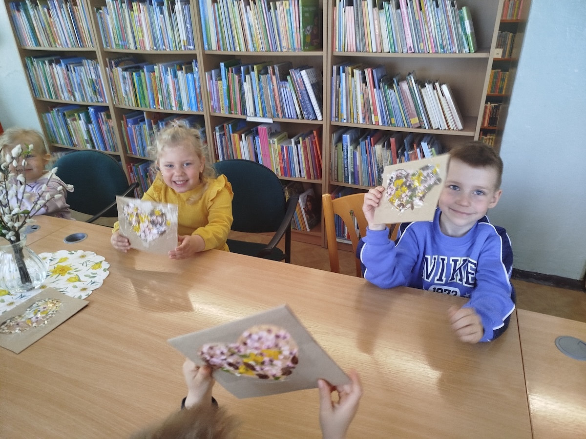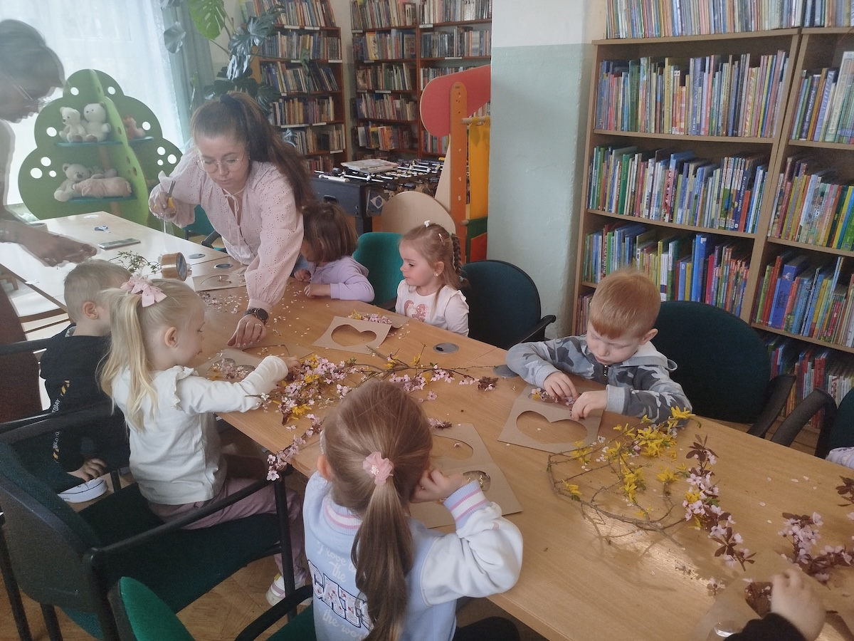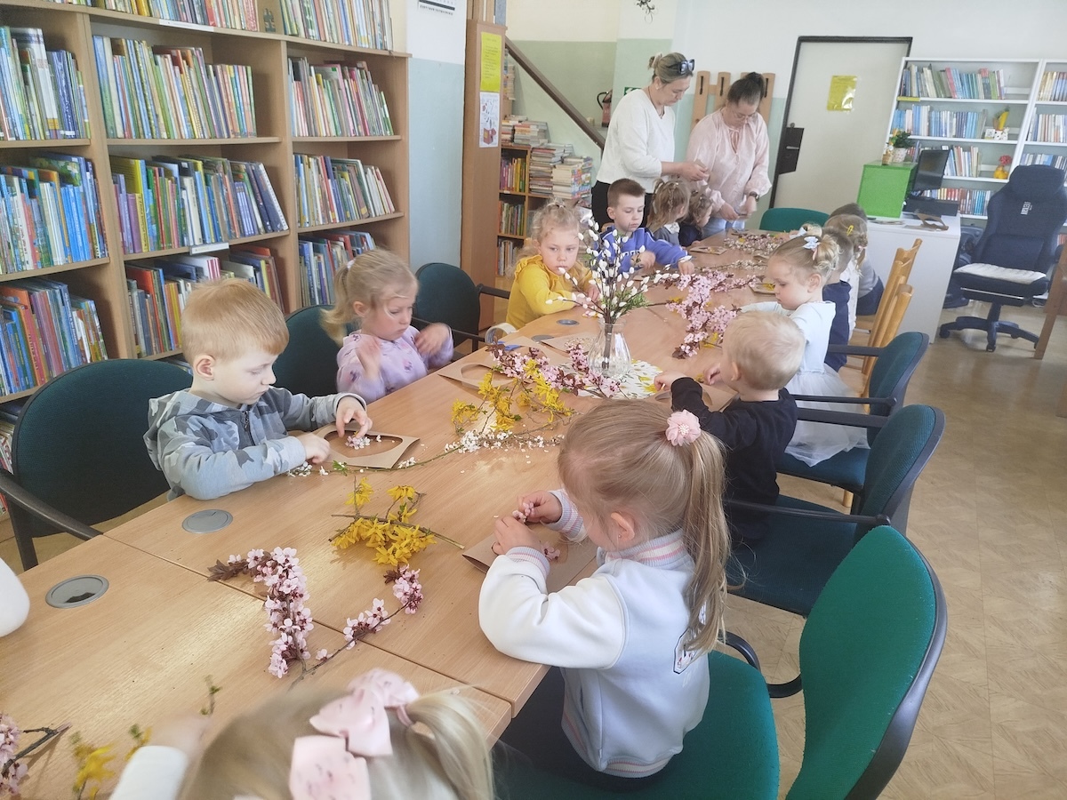 Dzieci wysłuchały bajek czytanych przez panie. Następnie wykonywały wiosenne zakładki do książek wykorzystując wiosenne dary natury.