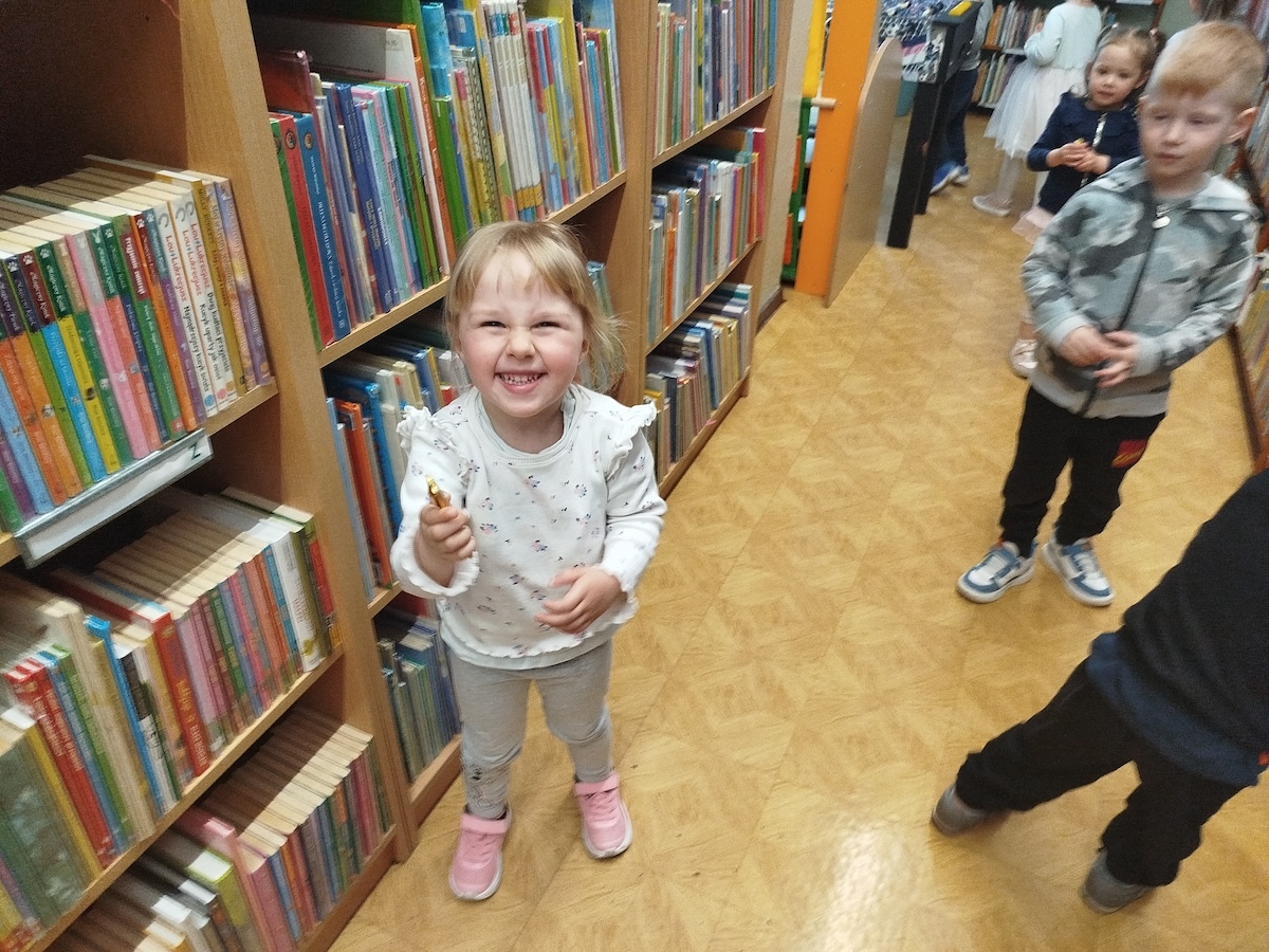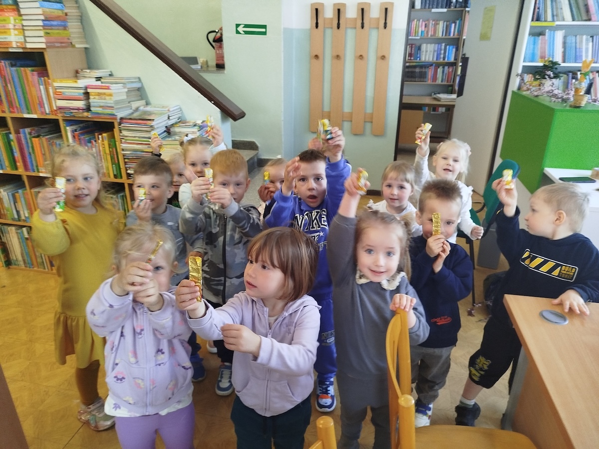 Na przedszkolaki czekała także smaczna zabawa – dzieci szukały czekoladowych zajączków ukrytych na półkach z książkami.