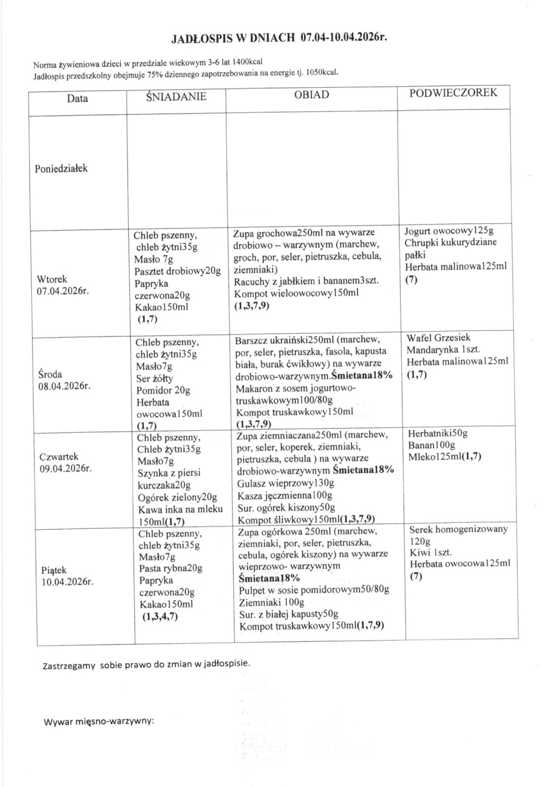 Jadłospis w dniach 07-10.04.2026